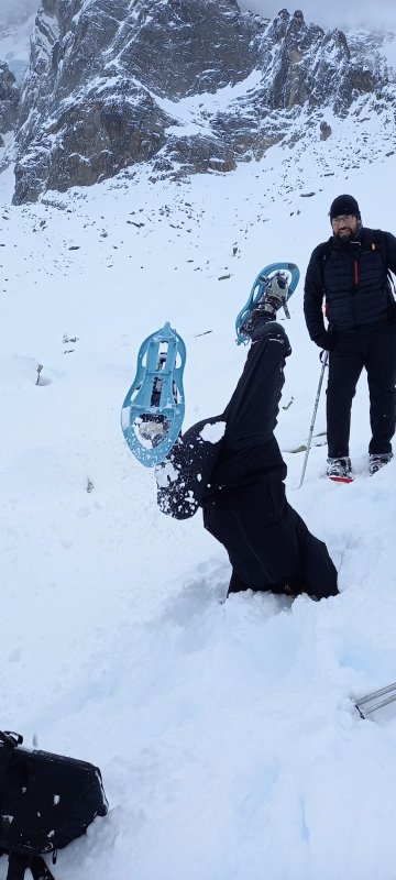 Snow shoes or La Raquettes in French, are a must for snowy mountain terrain. They work by distributing my weight over a larger surface area allowing me to walk and not fall waist deep in snow.