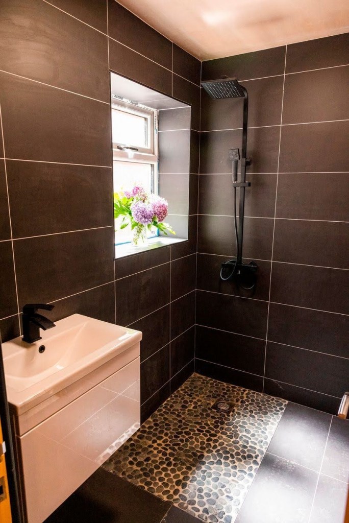I went for a big shower instead with pebble tile flooring. I used the space under the stairs for the toilet and placed the shower by the window, the sink fits snug by the door and there a massive cupboard space under the stairs too.