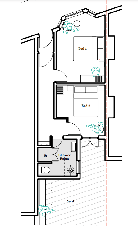 My big problem was that the only access to the yard was now via a bedroom, less than ideal, but my more immediate problem was there was no room for a bath in the bathroom! I achieved this by ditching the idea of a bathroom and turning it into a wet room. I could have fit a small bath tub in there, or I could opt for a large shower instead.