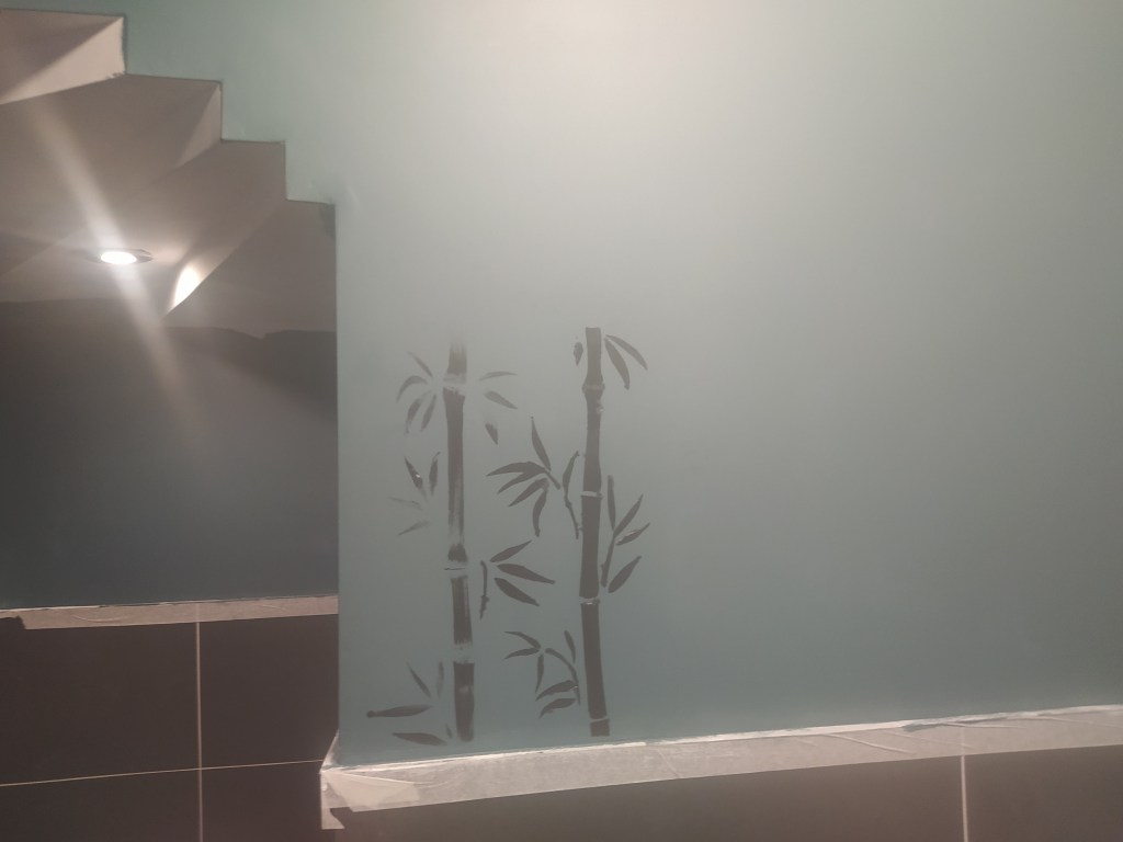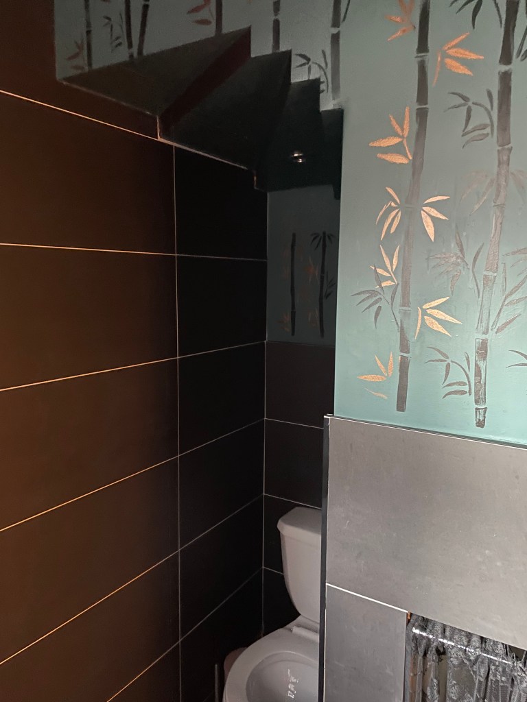 Inspired by my recent trip to Wuhan, before the whole sexy pangolin debacle, I bamboozled my way through decorating the bathroom with donated paint and a bamboo stencil.