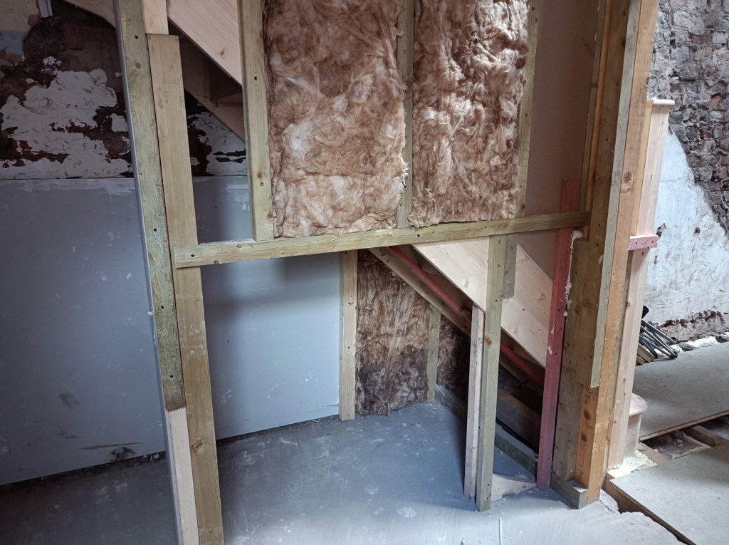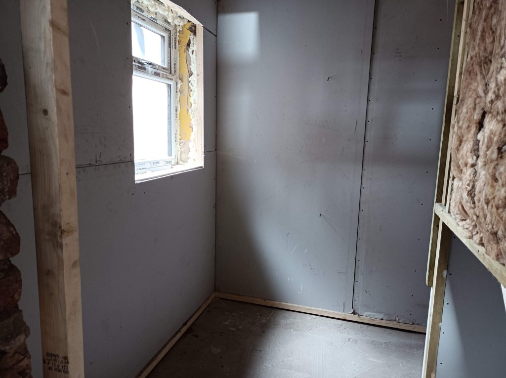 Back door blocked off on the outside and insulated and plaster boarded on the inside.