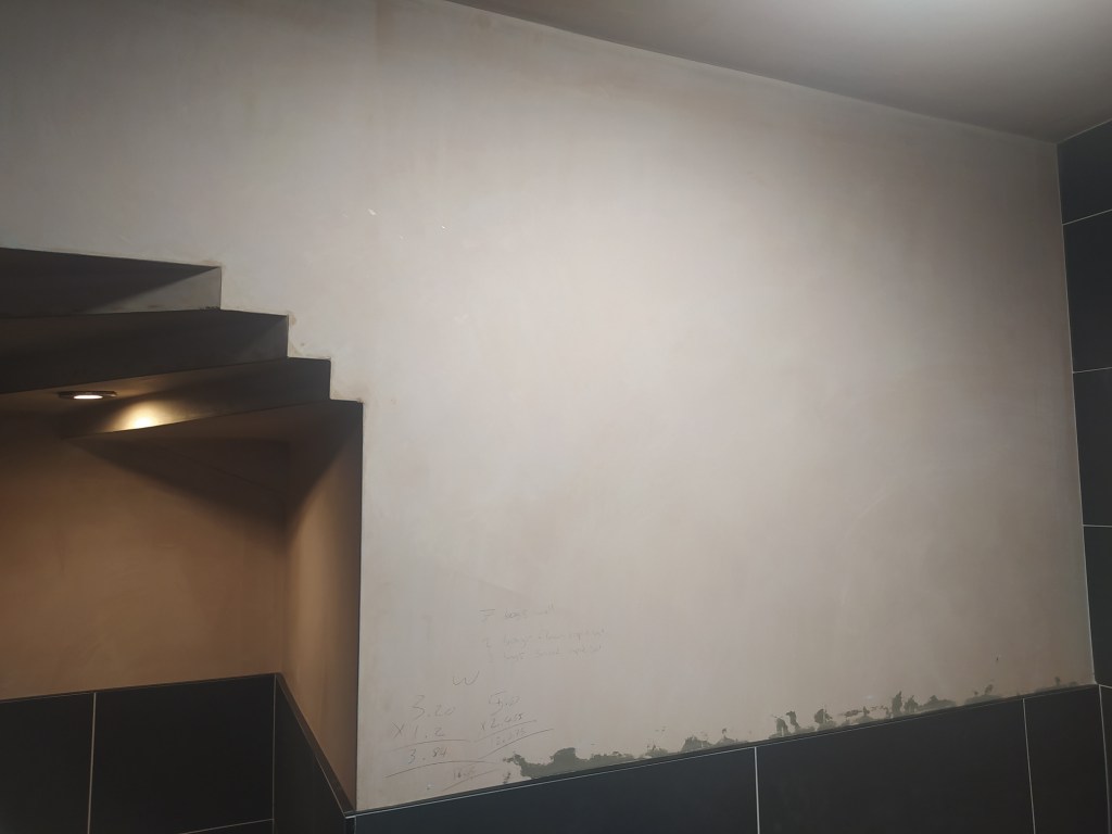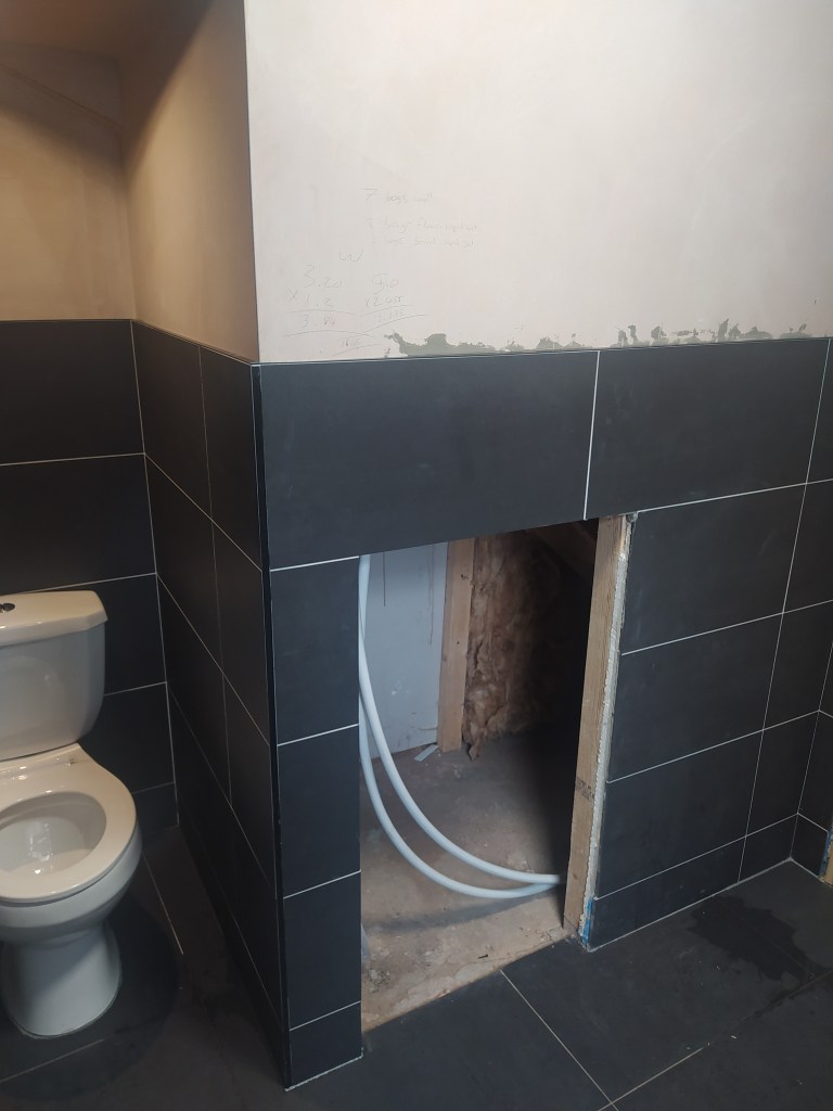 Plumb, plaster and then the tiler came. Expect to pay around £40/m2 for a good tiler. He also tanked the bathroom and installed an electric mat of UFH.