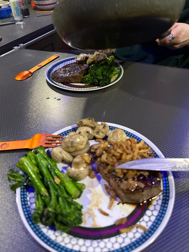 Everything you need for a steak dinner. Once the top is popped you can stand up, which at 5”9 really heightens my experience.