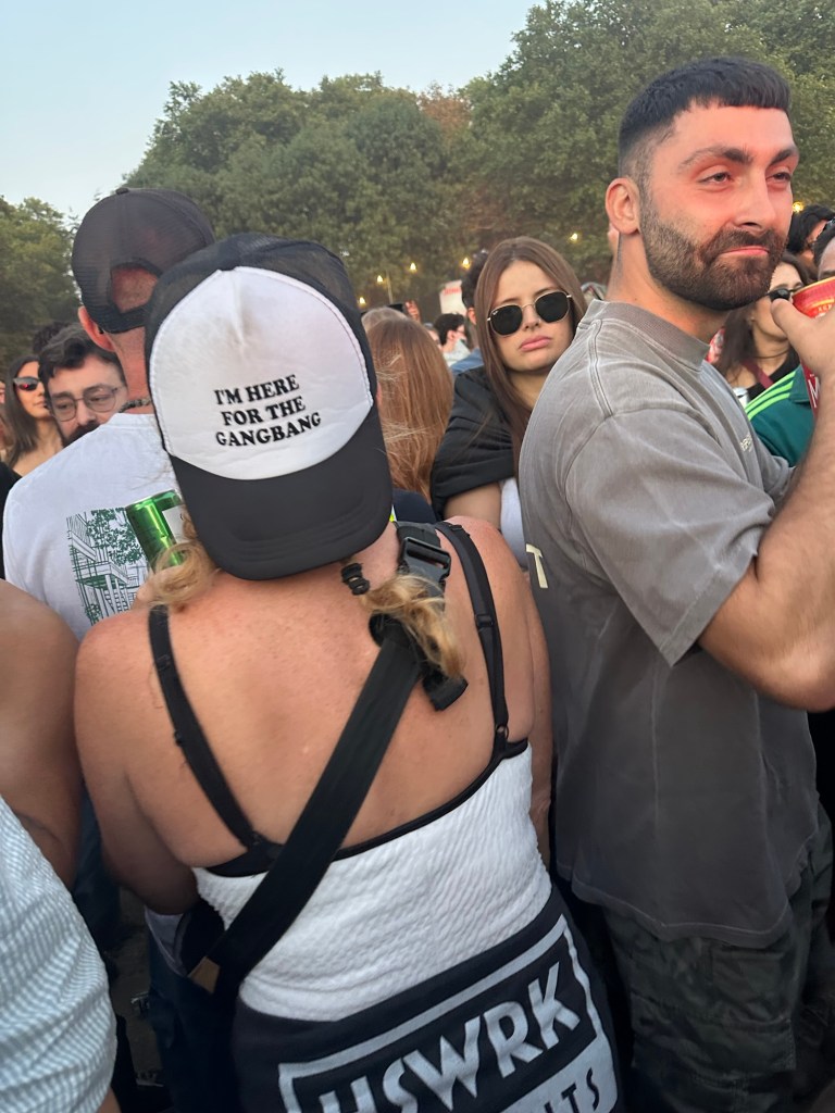 By the time the set ended, I was drenched and my throat raw. I stumbled out, lungs grateful for the open air and made straight for the bar. A can of water, a gin and tonic. Standing there I thought: fucking boiling in there, peak kindness was a wet wipe from a stranger in the toilet queue and second-hand smoke is a right cunt.